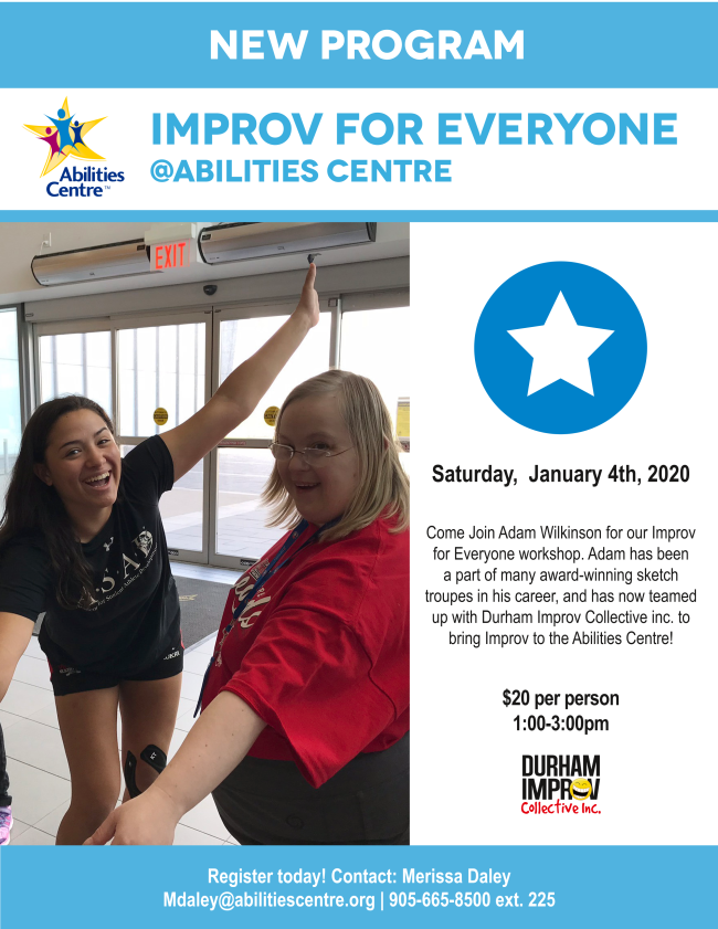 Want to check out the class first? Come to a two hour session with Adam on Jan. 4th for only $20! Bring friends and family! Register with Merissa at: Mdaley@abilitiescentre.org