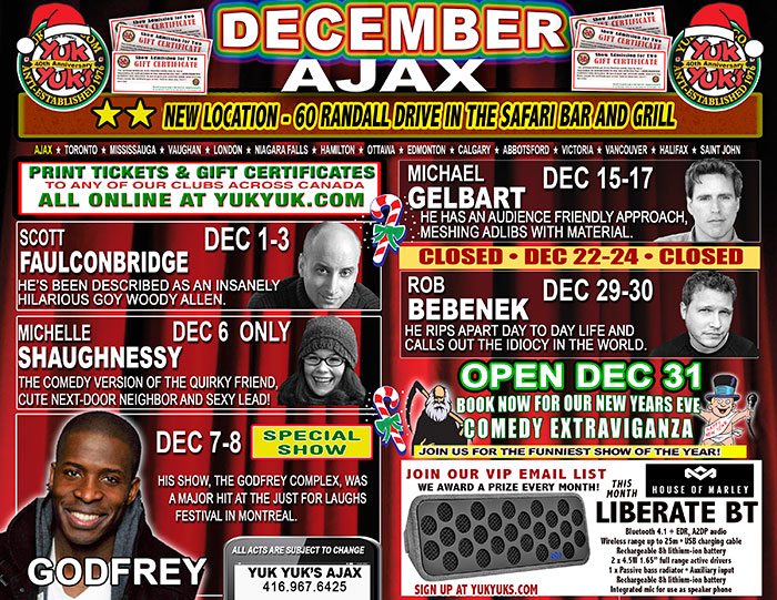 Yuk Yuk's Ajax - Shows In December?Dec 6 Michelle Shaughness yDec 7-8 Godfrey SpecialDec 15-17 Michael GelbartClosed Dec 22-24Dec 29-30 Rob BebenekPurchase tickets online< /a>Everyone Loves to Laugh!GIFT CER TIFICATES AVAILABLE HERE60 Randall Drive - Lower Level Of The Safari Bar & GrillCanada's National Stand-Up Comedy Companywww.yukyuks. com -- This message was sent to tony@allaboutwebservices.com by noreply@y ukyuks.comTo forward this message, please do not use the forward button of y our email application, because this message was made specifically for you o nly. Instead use the forward page in our newsletter system.To change your details and to choose which lists to be subscribed to, visit your personal preferences pageOr you can opt-out completely from all future mailings.![]()